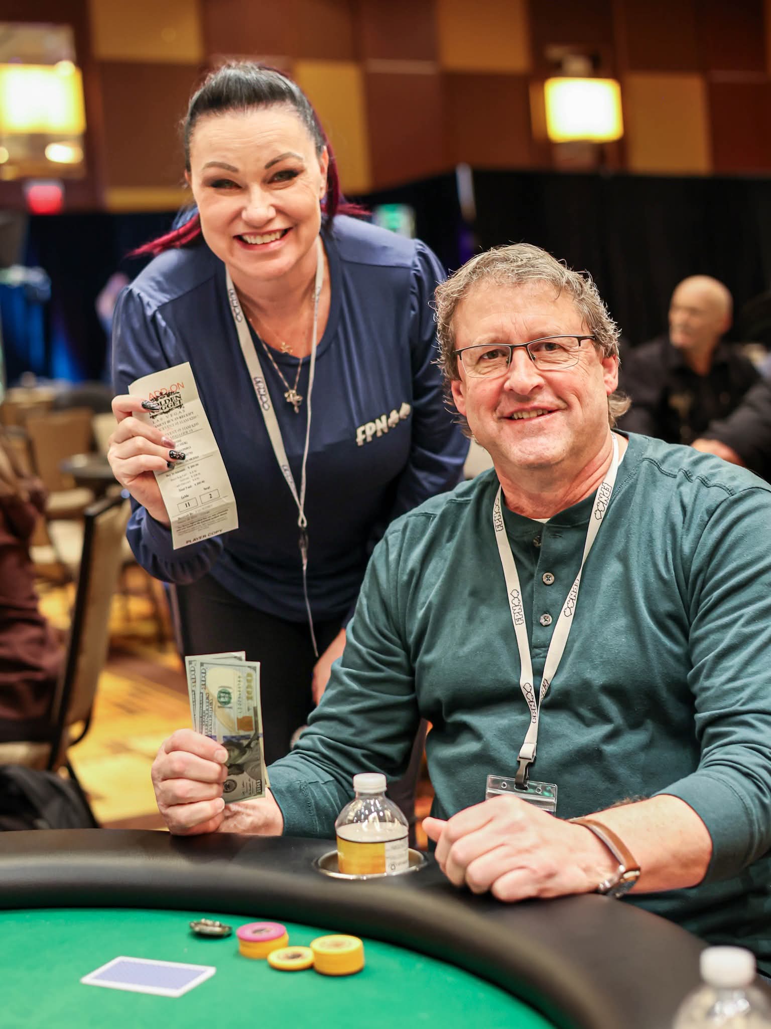 Beyond the felt, the celebration continued with the 1:00 PM cash drawing, where Tom Schumacher from South Dakota claimed $200. Cash drawings will continue daily at 1:00 PM and 7:00 PM, along with random FPN merchandise giveaways. Players can enter by placing receipts from qualifying events into the drawing drum located at the front of the room.